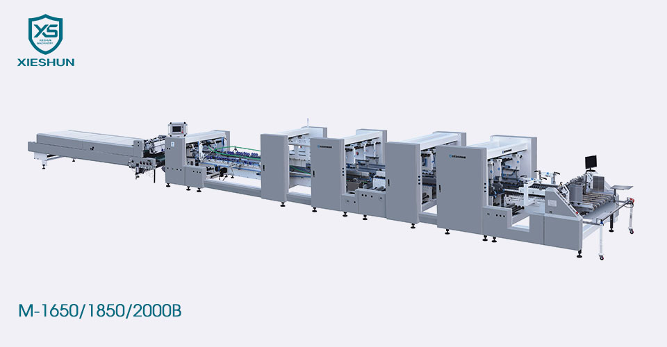 China XIESHUN M-1650/1850/2000B carpeta de bloqueo de fondo corrugado de trabajo pesado automático Gluer, use PLC y componentes electrónicos importados, alimentador con servomotor independiente, la placa interior se mueve utilizando guías lineales para garantizar la precisión y la facilidad de operación.
